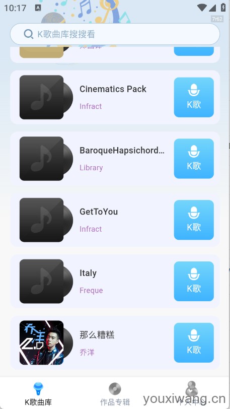 4、找到想唱的歌曲之后点胶机“k歌”即可。