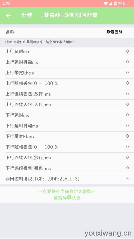 3、支持用户自定义调整弱网模版参数,如上下行延时、丢包率等,并可保存设置。