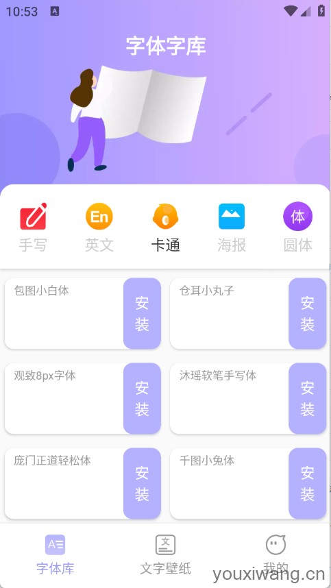 2、帮助大家美化手机系统字体的软件。当中集成了精心挑选的多种风格各异的字体。