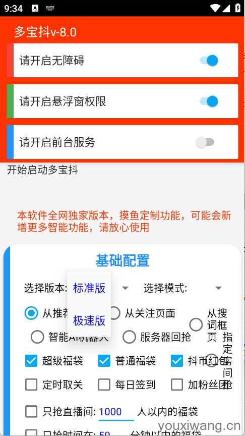 摸鱼福袋助手,专门为抖音打造的抢福袋助手,可以同时抢购多个直播间的福袋,设置抢福袋得时间,到时会自动抢,不会造成封号的现象,灵活控制抢包的时间范围,提升抢福袋成功的几率。