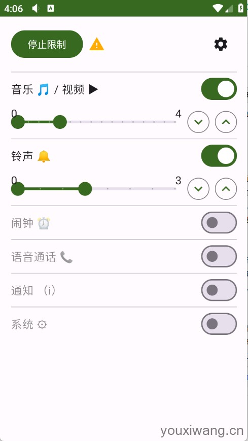 音量限制器,主要是替代手机的音量键,包括闹钟、电话以及通话等音量的控制,如果觉得手机自带的扩音器声音不够大,用户就可以使用本软件进行扩音,还会根据时间自动调整音量。