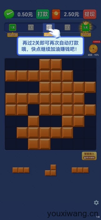 多财多亿玩法就是把各种图案的拼图块拼在一起,消除它们来达到过关的目标。过关后有机会拿到奖励和红包,这让玩家在享受游戏乐趣的同时,还能有点小收获,并且红包也可以轻松提现,积攒到0.3直接就可以提到钱包。