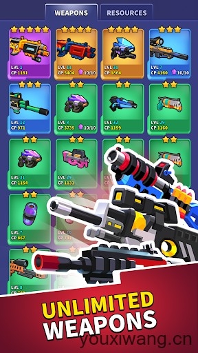 3、丰富多样的武器将会在挑战中不断解锁,自由的去配置你的武器,在战斗中灵活的切换使用,帮助你顺利闯关。