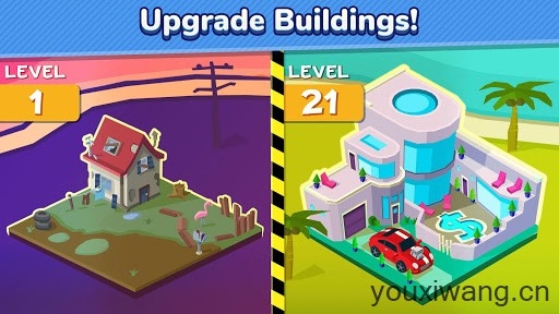 3、解锁并升级新的建筑,不仅能够让建筑的收益越来越高,还能够不断的完善外观,让它看上去更加辉煌。