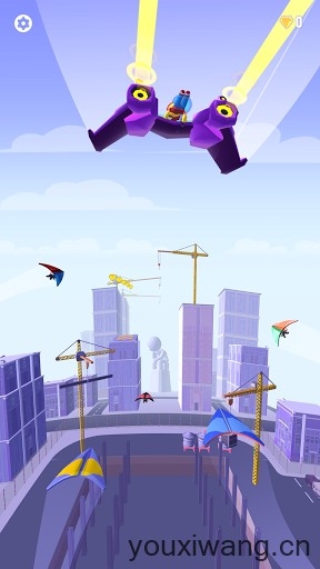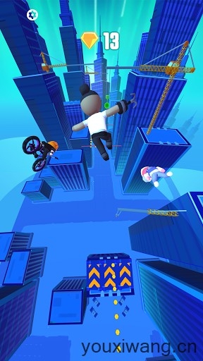 2、借由绳索的能力灵活的穿梭在城市中,寻找好每一个落点,让你能够更快的抵达终点,获得更多奖励。