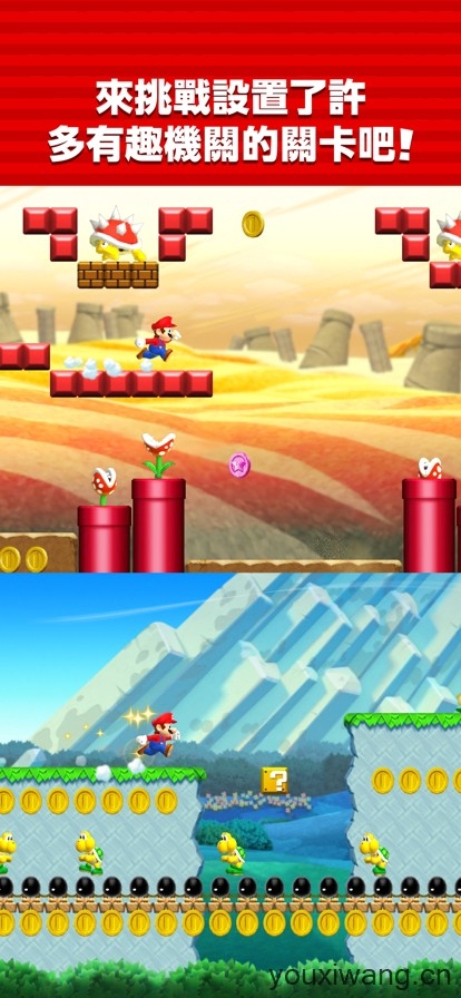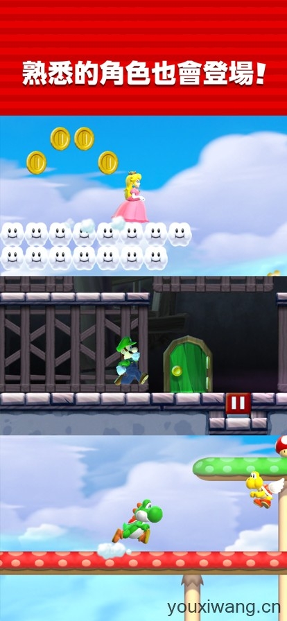 超级马里奥跑酷,原名Super Mario Run,是以超级马里奥为主题的休闲跑酷游戏,玩家将操控马里奥收集金币拯救公主和奇诺比奥王国。在超级马里奥跑酷里有3不同的模式玩法可以体验,丰富的跑酷关卡可以让你去游玩,不同的角色和装饰将等你去闯关解锁,不断收集更多的金币来体验全新的跑酷冒险吧。