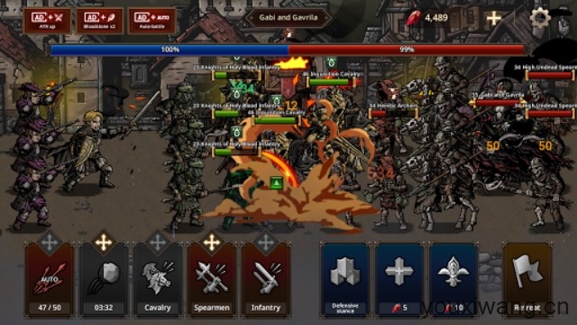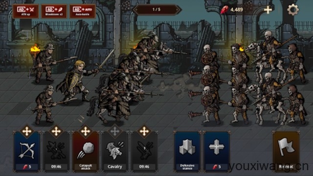 2、接着就是正式开始战斗了,游戏中你的士兵们会自动前进,遭遇怪物后双击士兵卡牌即可突袭进攻。