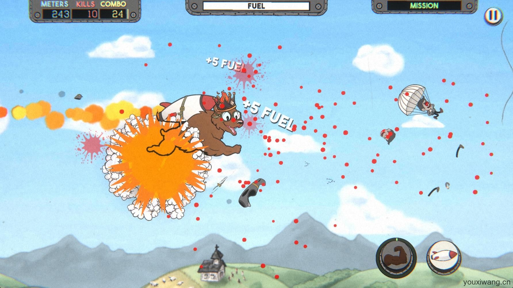4、屏幕正上方是你的燃料,触碰敌人的子弹会导致火箭受损并损失燃料,击败敌人可以补充燃料。
