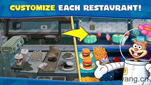 海绵宝宝餐厅模拟器,也可以叫做海绵宝宝大闹蟹堡王,英文原名为SpongeBob:Krusty Cook-Off,是以风靡全球的知名动画《海绵宝宝》为原型所改编的一款趣味模拟经营游戏。游戏中,玩家们将会扮演海绵宝宝,是蟹老板的餐厅中的首席厨师,为客人们带来蟹黄堡和其他更多美味的食物,并且还会邂逅章鱼哥、珊迪和派大星等耳熟能详的角色,体验全新有趣的独家故事剧情!除此之外,玩家们还可以去选择各种家具、装饰品来装扮餐厅,并升级厨房设备,提高运营的效率和客人们的满意度!
