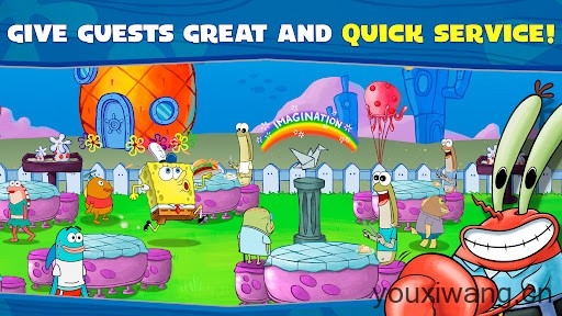 1、和海绵宝宝一起体验精彩有趣的烹饪之旅吧!制作各种各样的美味食物,让每一位客人都能满意,不断的吸引更多的客人前来用餐。