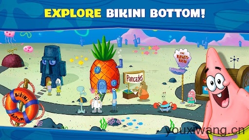 2、在蟹堡王烧烤美味的蟹堡馅饼,去Sandy的圆顶树屋烹制肋条和牛排,前往逊咖欢乐屋制作热狗,比基尼海滩、酷乐湖以及更多地点的新老餐厅和厨房等待你探索。