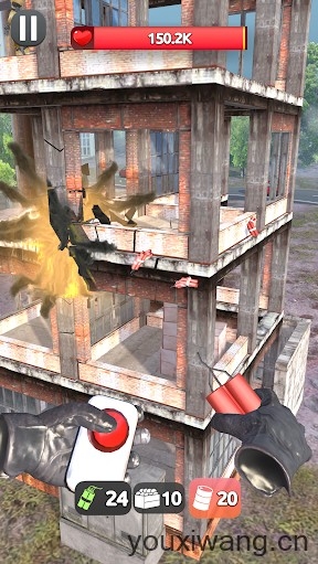 3、安排炸弹后就会出现遥控器,点击即可引爆,随后对建筑造成伤害。